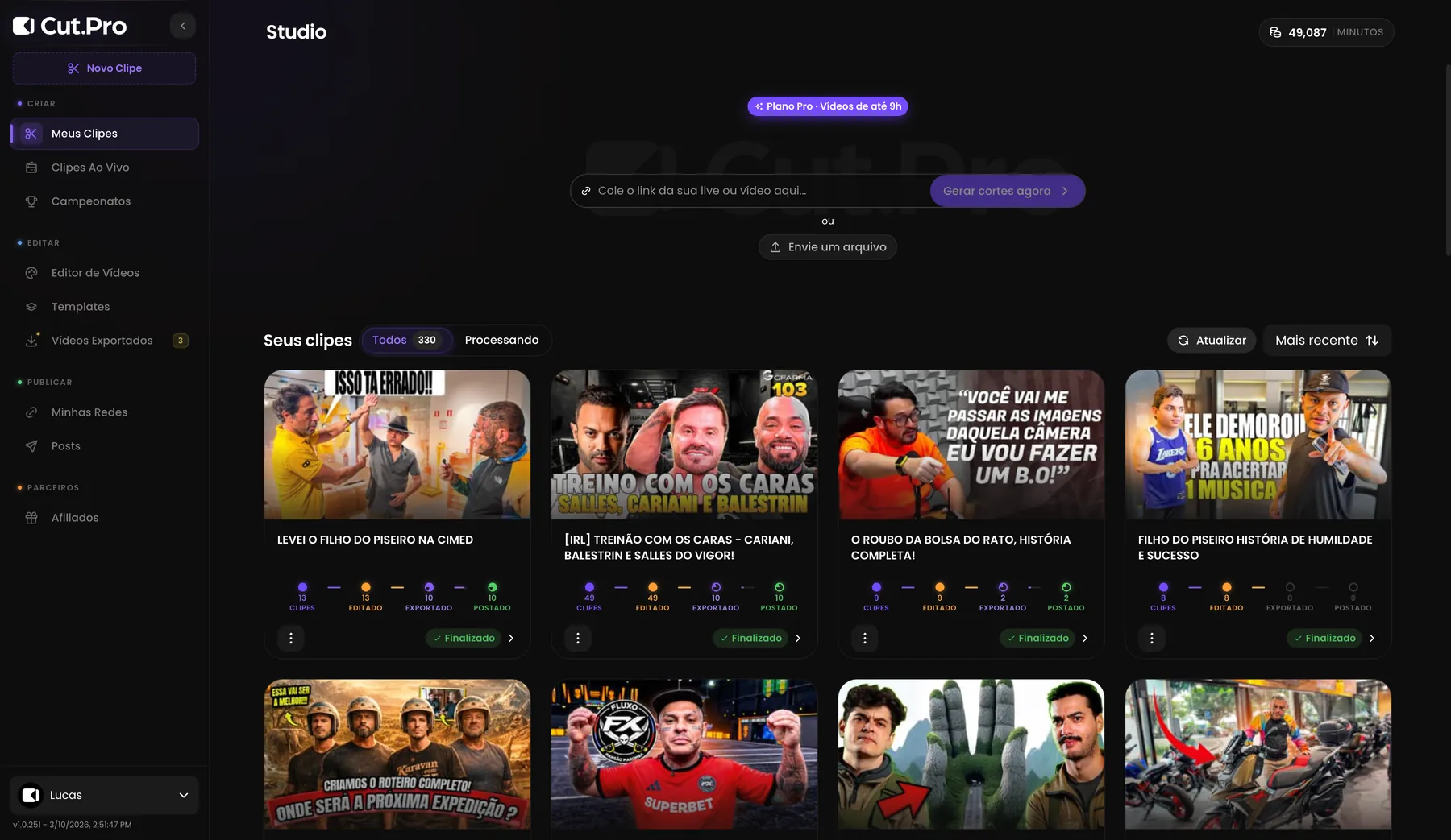"O CutPro facilitou muito minha vida! Em poucos minutos consigo transformar lives e vídeos longos em clipes prontos para postar."