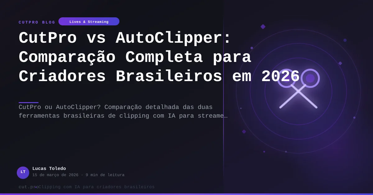 CutPro ou AutoClipper? Comparação detalhada das duas ferramentas brasileiras de clipping com IA para streamers, criadores individuais e agências em 2026. Preços reais, recursos, Twitch, Kick e muito mais.